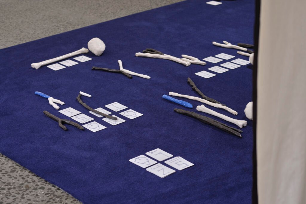 At the centre of the installation is a hand-stitched textile screen that divides the gallery space. Working on opposite sides of the screen, each artist arranges ceramic forms — sticks and stones, bones — into ephemeral configurations that invoke the logic of an alphabet without resolving into one. Neither performer can see what the other is making. A two-channel video work, Two Channel Alphabet, uses live-streamed and recorded security camera footage to give audiences simultaneous views of both sides — a perspective structurally denied to the performers.