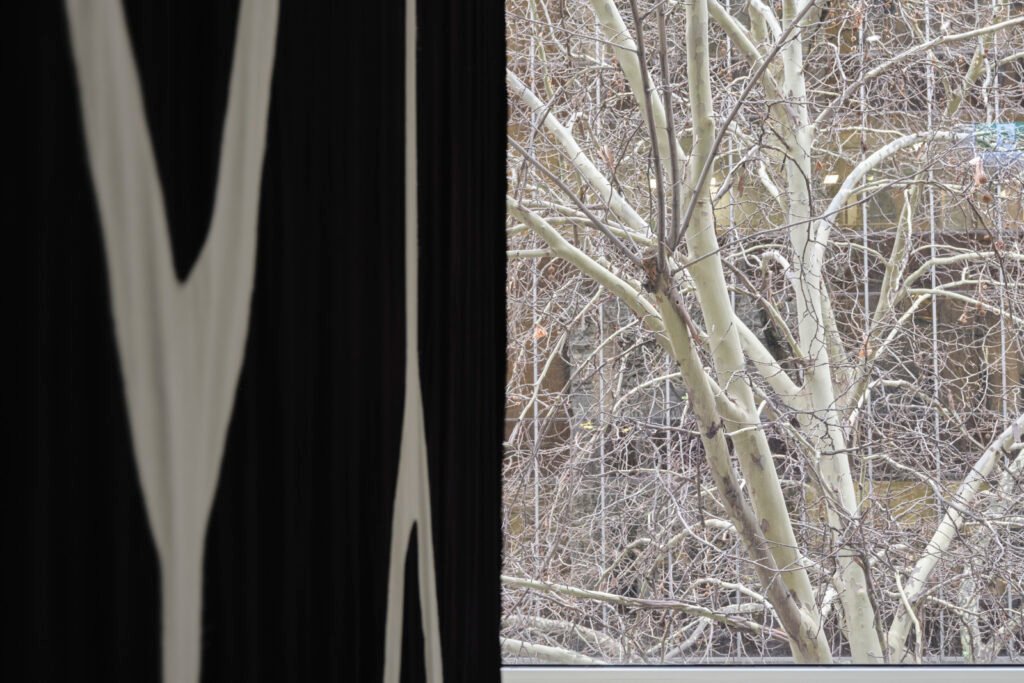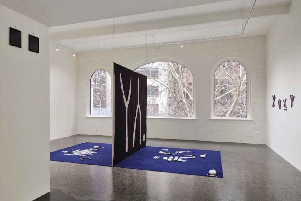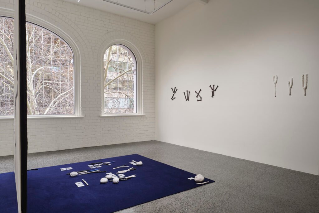 At the centre of the installation is a hand-stitched textile screen that divides the gallery space. Working on opposite sides of the screen, each artist arranges ceramic forms — sticks and stones, bones — into ephemeral configurations that invoke the logic of an alphabet without resolving into one. Neither performer can see what the other is making. A two-channel video work, Two Channel Alphabet, uses live-streamed and recorded security camera footage to give audiences simultaneous views of both sides — a perspective structurally denied to the performers.